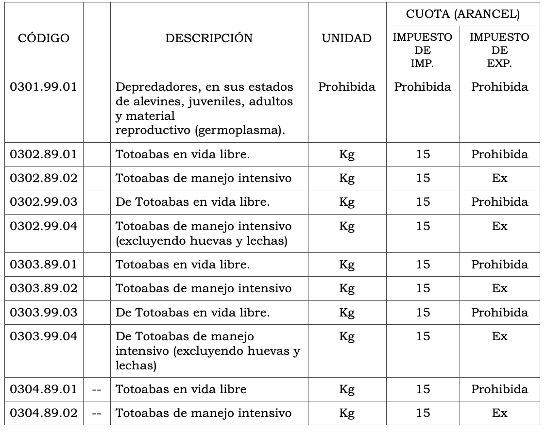 Mediante Decreto emitido por el ejecutivo federal el 21 de julio de 2025 en su edición matutina, “Se reforman y adicionan diversas disposiciones de la ley de los impuestos generales de importación y de exportación”, en la que se agregan 6 nuevas fracciones arancelarias, se modifican 5 fracciones ya existentes y se adiciona una nota de capítulo con la finalidad de establecer un cumplimiento de regulaciones y restricciones no arancelarias, específico para especies silvestres, tanto de “vida libre” como de “manejo intensivo” indicadas en el capítulo 3 “Pescados y crustáceos, moluscos y demás invertebrados acuáticos.”